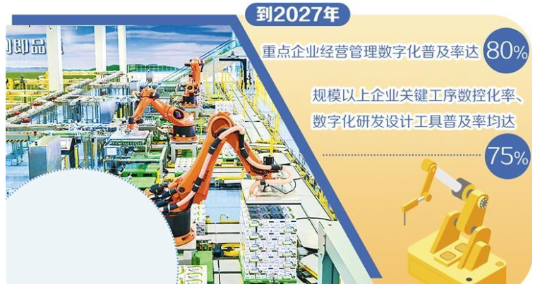 工業和信息化部等7部門日前印發《食品工業數字化轉型實施方案》(以下簡稱《實施方案》)提出,到2027年,重點企業經營管理數字化普及率達80%,規模以上企業關鍵工序數控化率、數字化研發設計工具普及率均達到75%,打造百個數字化轉型典型應用場景,梯次實施千個數字化示范(試點)項目。