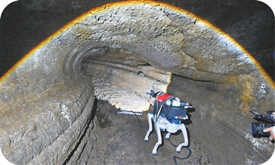 圖為柔性臂機器人在鏡泊湖火山地下熔巖管道現場工作。張春祥攝(人民視覺)