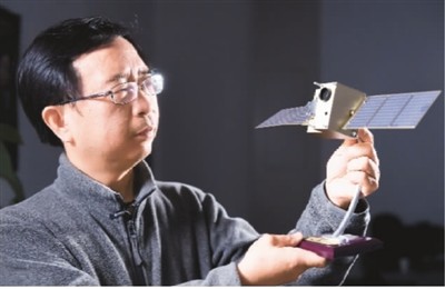 中科院院士潘建偉在辦公室內與“墨子號”量子衛星模型合影。(新華社記者 張端 攝)