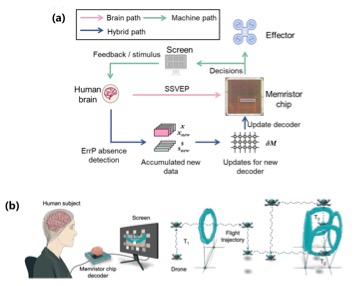 (a)腦-憶阻器交互式更新框架;(b)基于憶阻器腦電解碼的實時腦控無人機飛行。(聯合研究團隊供圖) 實驗結果顯示,新方案相較于傳統方案,解碼速度大幅提升,能耗顯著降低。更令人矚目的是,在連續6小時的長時程交互實驗中,系統性能不僅保持穩定,準確率還提升了約20%。這一成果無疑為腦機接口技術的實用化奠定了堅實基礎。 天津大學腦機海河實驗室教授許敏鵬表示,這項研究不僅實現了生物智能與機器智能的互適應、互學習,還為未來腦機接口系統的發展提供了重要的理論基礎與技術支撐。他透露,團隊計劃將這一系統拓展至更多便攜式或可穿戴設備中,以滿足不同場景下的智能人機交互需求。