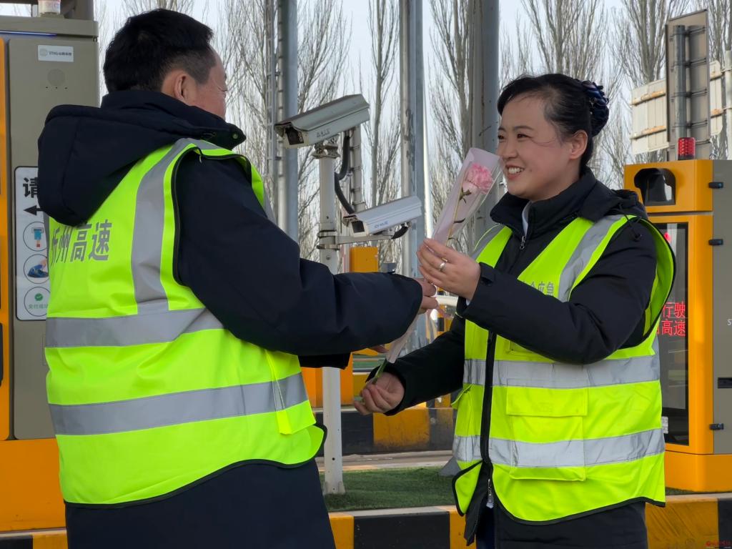 晨光初綻,山西交控忻州公司新廣武收費站的車道還浸潤著料峭春寒,新廣武收費站黨支部書記、站長躬身向車道巡檢的女職工送上一束裹滿晨露的康乃馨鮮花,女職工接過花束時,指尖觸碰的不僅是鮮嫩花瓣,更是一份并肩前行的溫度。春風吹散她鬢角的碎發,卻吹不散嘴角漾開的笑意——那是被看見、被珍視的感動,如同花瓣上顫動的露珠,折射出平凡崗位里的璀璨微光。