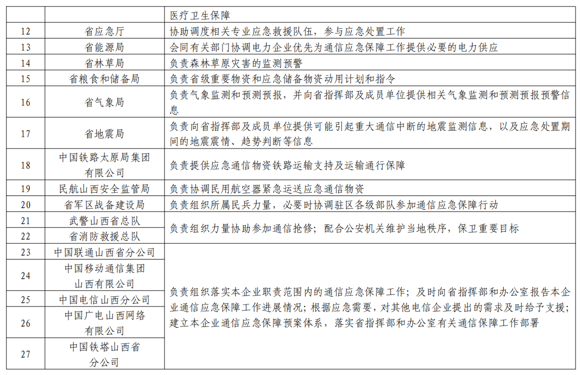 成員:省通信管理局、省委宣傳部、省委網信辦、省發展改革委、省公安廳、省財政廳、省自然資源廳、省交通廳、省水利廳、省衛健委、省應急廳、省能源局、省林草局、省糧食和儲備局、省氣象局、省地震局、中國鐵路太原局集團有限公司、民航山西安全監管局、省軍區戰備建設局、武警山西省總隊、省消防救援總隊以及省基礎電信企業等部門單位相關負責人。