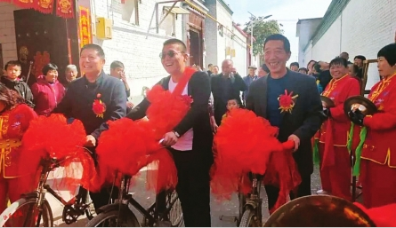 婚禮當(dāng)天,杜家寨社區(qū)兩委班子陪著新郎官一起,騎上老式帶大梁的自行車。新郎官身上披紅掛彩喜氣洋洋,車上挽著大紅花,在鄉(xiāng)親們的簇?fù)砗屯L(fēng)鑼鼓隊(duì)的陣陣鼓樂(lè)聲中,騎行來(lái)到新娘子的家中,把美麗的新娘子抱在自行車后座的紅墊子上,熱熱鬧鬧地娶回了家。