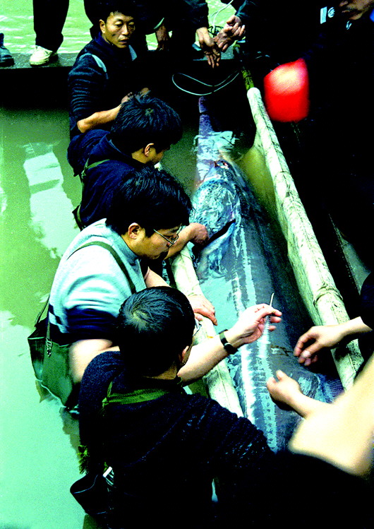 ▲2003年1月27日,在四川宜賓主城區附近的長江岸邊,專家正在對一只白鱘進行救治,這只白鱘是一位漁民在涪溪口發現的。