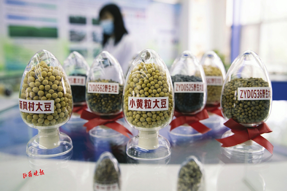 在黑龍江寒地作物種質資源庫內展出的大豆種子(5月19日攝)。