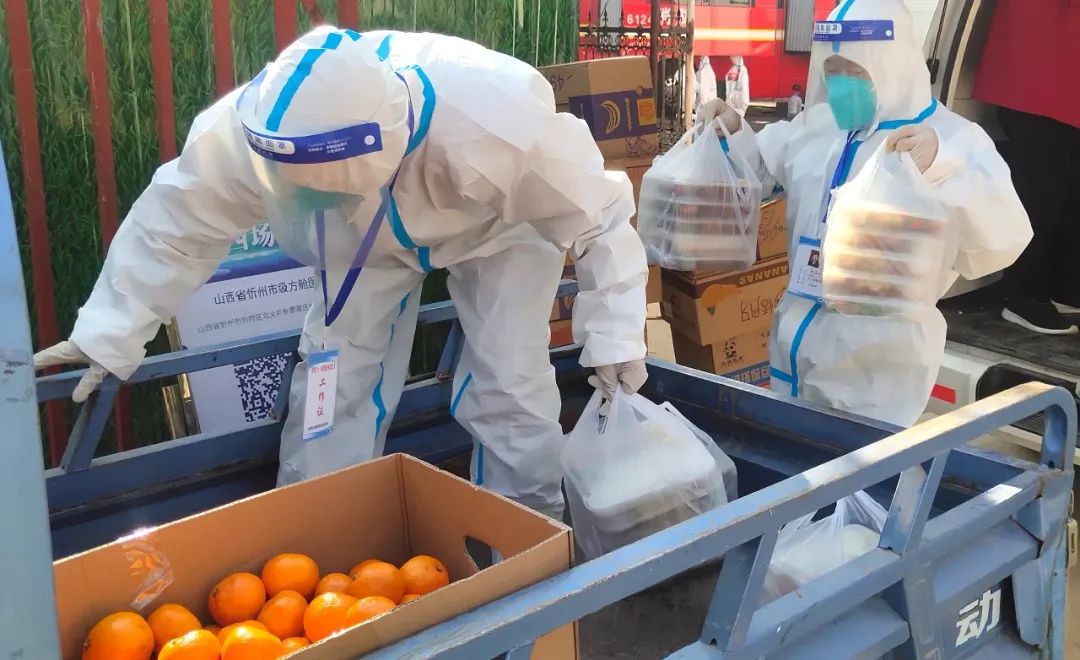 市級方艙醫院啟用以來,作為抗疫主力軍的護航者,后勤是這場疫情保衛戰的關鍵一環。為做好方艙醫院運行后的餐飲、生活用品及工作人員的住宿等后勤保障服務工作,忻州市級方艙醫院后勤保障工作組夜以繼日,辛苦奉獻,始終和醫療團隊從黑夜到黎明奮戰在一線。18日中午12點,記者來到忻州市方艙醫院大門口看到,方艙內外保障組工作人員正在交接餐食,一包包盒飯、水果從餐車拿出來放到三輪車上,然后由艙內后勤保障組工作人員送到方艙內醫護人員的手中。