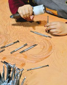 李金云和父親在雕刻前用水濕潤皮革,將其變軟增強可塑性。