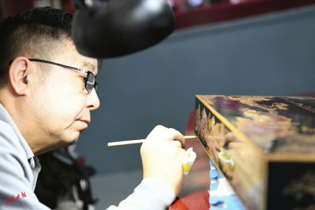 5.山西省工藝美術大師雷天勇在進行漆器創作。