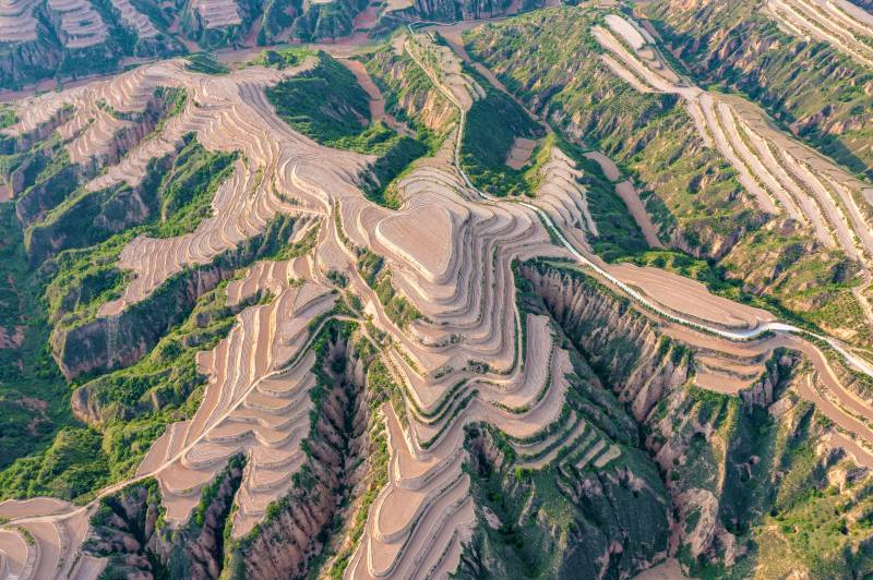 站在永和梯田觀景臺(tái)上,一壟壟地膜像一條條白色的絲帶,纏繞在層層疊疊的梯田間。連綿的山坡間、山塬上,鋪滿了綠色的盛裝——油松、連翹,還有地里的高粱苗,正孕育著無限的生機(jī)活力。