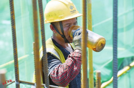 當日,是入伏第一天,意味著開始進入一年中最熱的時候。在熱火朝天的施工現場,工人師傅們埋頭苦干,他們雖然戴著自制遮陽帽、冰袖,身旁放著水壺,但一小會兒工夫就會汗流浹背。“這樣的杯子,我每天要喝好幾杯水。”天氣太熱,來自四川樂山的林英把杯子里的水一飲而盡。黝黑的皮膚、如雨的汗水、潮濕的后背……當大多數人避暑納涼時,不少勞動者卻辛勤地揮灑著汗水,堅守在施工一線。在這個工地上,有很多和林英一樣的打工人,他們來自全國各地,用青春和汗水建設美麗山西。