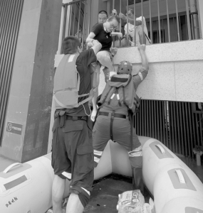 當(dāng)?shù)乇焕д卟戎轿魈忑埦仍?duì)隊(duì)員的肩膀上沖鋒舟。