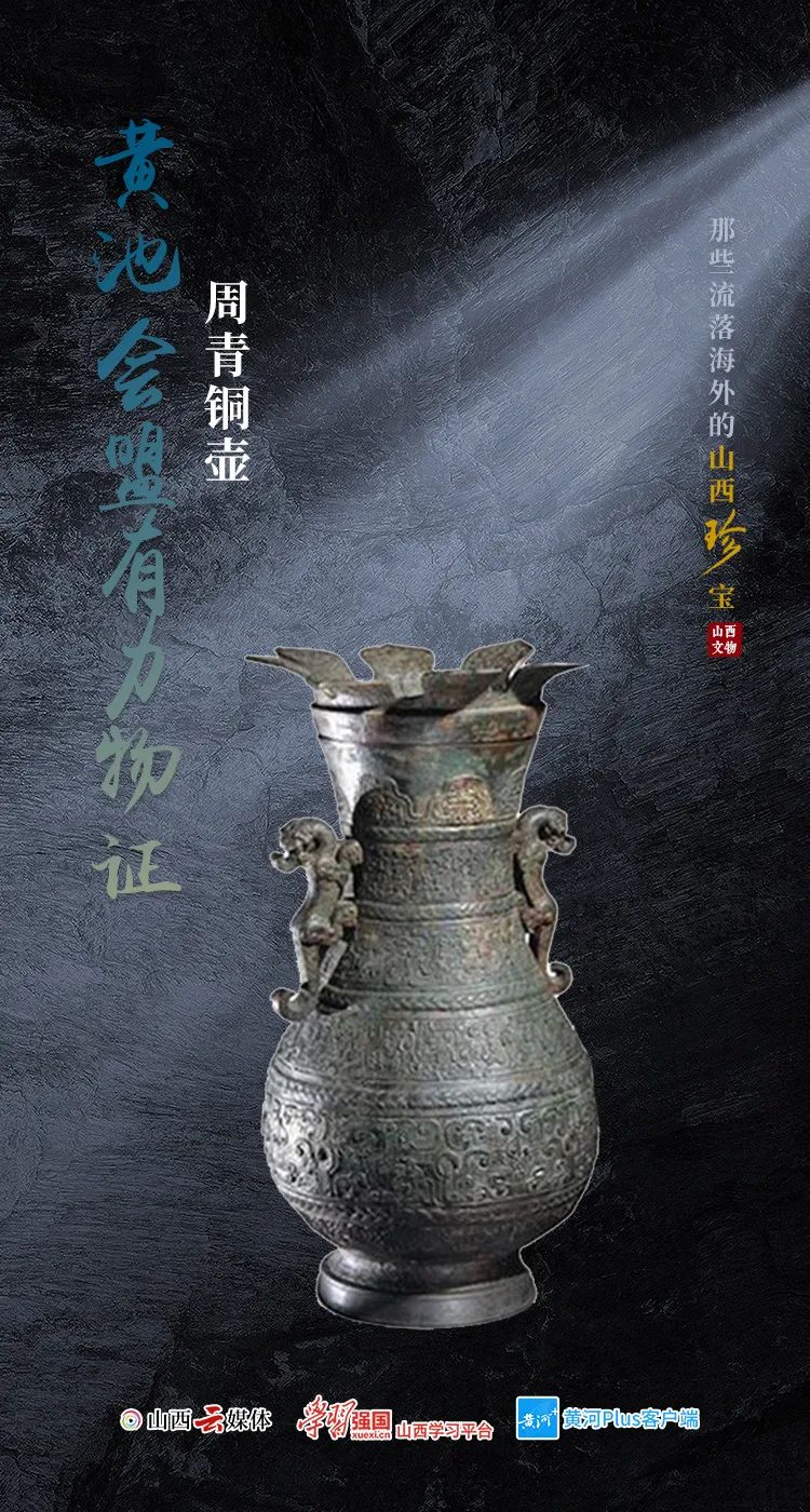 周青銅壺,又稱趙孟青銅壺。這對銅壺高51厘米,公元前5世紀由山西侯馬的晉國鑄造廠制作。這對青銅壺長頸中部收束,腹部圓鼓,蓋為內插式,上有七片外張的斜蓮辦,遍身饕餮和蟠螭紋,壺頸部置一對顧首螭虎耳。青銅器壺蓋外緣刻有19字銘文:“禺(遇)邗王于黃池,為趙孟疥(介)邗王之惖(賜)金,臺(以)為祠器。”