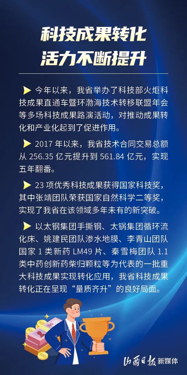 制定出臺激勵科技成果轉化法規政策24個、技術合同交易總額實現五年翻番、科技成果轉化引導專項五年累計投入2.21億元……近年來,我省科技成果轉化堅持新發展理念,加速科技成果在晉落地轉化和產業化,取得顯著成效。