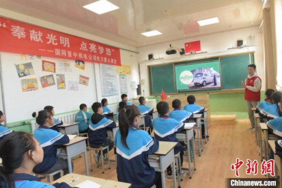 在國家電網“電力愛心教室”內,電力人員為鄉村兒童科普電力知識。展望攝