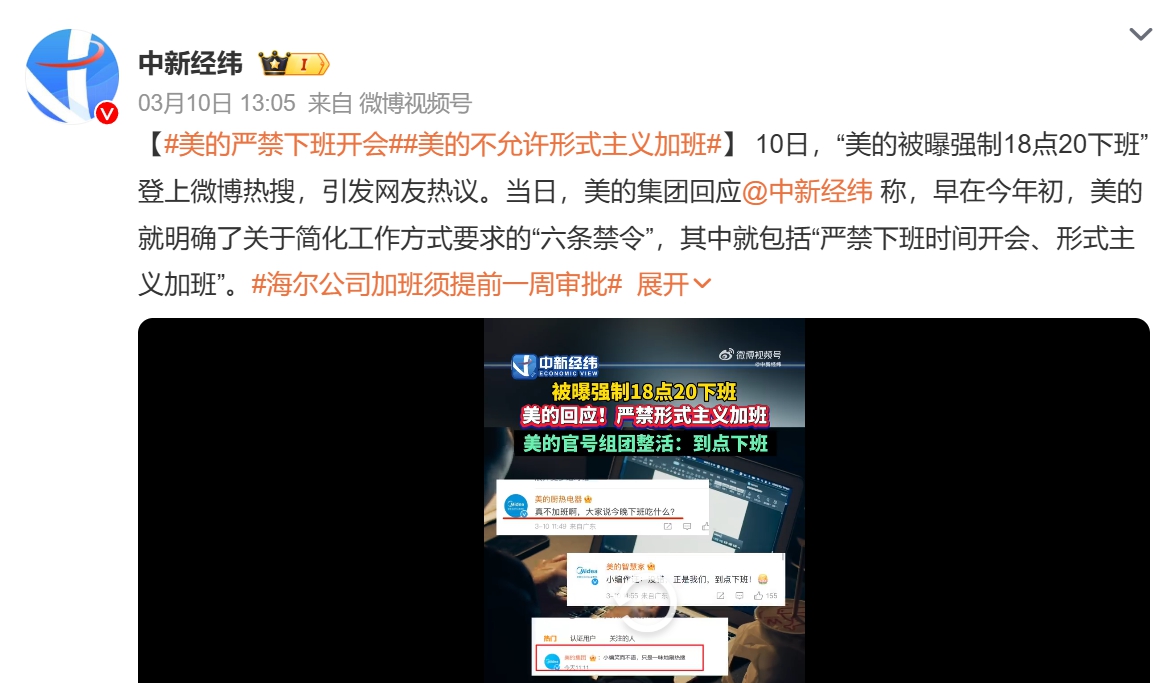 美的回應(yīng)媒體時(shí)表示,今年以來,美的明確了關(guān)于簡化工作方式要求的“六條禁令”,其中就包括“嚴(yán)禁下班時(shí)間開會(huì)、形式主義加班”。