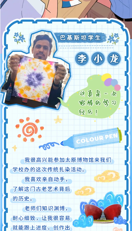 隨著國(guó)際博物館日臨近,太原市博物館開(kāi)展聯(lián)動(dòng)中外的“流動(dòng)博物館”主題活動(dòng),來(lái)自太原科技大學(xué)國(guó)際教育學(xué)院近30名不同國(guó)家的留學(xué)生,參與中國(guó)非遺扎染技藝工作坊。 國(guó)際青年們認(rèn)真聆聽(tīng)扎染的歷史淵源與工藝精髓,并通過(guò)分步演示,親自體驗(yàn)“絞纈”技法。留學(xué)生們?cè)谒厣浇砩险郫B、捆扎、浸染,創(chuàng)作出各具特色的紋樣。 讓我們一起來(lái)看看國(guó)際青年的“扎染”日記吧~
