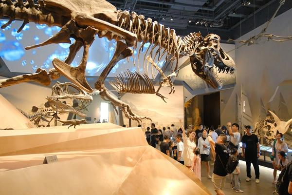 8月21日,浙江湖州,游客在恐龍館內(nèi)參觀。暑假進(jìn)入尾聲,位于湖州市安吉縣的浙江自然博物院熱度不減。視覺中國供圖