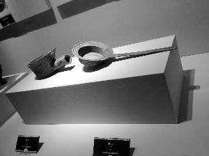 唐朝就已經有熨斗了。展廳中,展出了兩把熨斗,一把是唐朝的,一把是清朝的。唐朝的熨斗有一個短短的把手,中間是一個大凹槽。