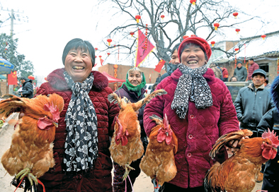 ▲村民展示自家養的土雞。1月16日,河南郟縣前莊村葫蘆套老街舉辦特色年貨大集,以及“話脫貧、感黨恩、謀發展”鄉村春晚活動。新華社發(郝源攝)