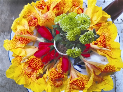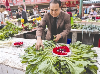 “那時孩子在成都理工大學上學,家里經濟壓力很大?!?年前,王美成接替妻子開始在城區賣菜,他發現有時菜并不好賣?!坝幸淮挝胰ゾ频陞⒓友鐣?,看到酒店里有的菜品裝飾挺好看,我就想是不是也可以把花裝飾在菜攤上。嘗試之后發現效果挺好,大家都喜歡?!?/span>