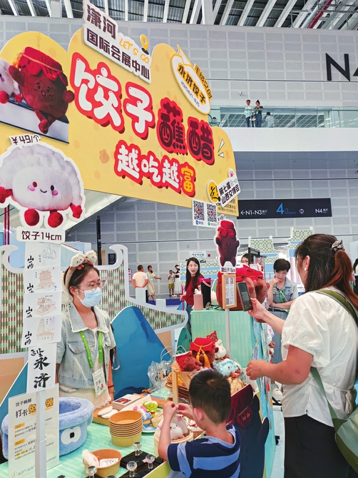 胖乎乎的餃子、圓墩墩的醋缸,摸一摸,毛絨絨的,手感柔順細滑。8月24日,第七屆山西文博會現場,位于山西瀟河國際會展中心N4館的文創山西展區,永濟市晉韻原創文創工作室獨特而醒目的門頭——“餃子蘸醋 越吃越富”,吸引了眾多參觀者的目光。該工作室展出的餃子蘸醋系列毛絨文創產品,也受到參觀者的關注和喜愛。