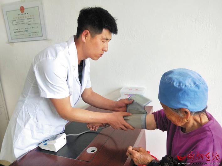 靜樂縣把健康扶貧和關愛送到村民家門口,為貧困群眾提供了實實在在的便利。圖為近日中莊鄉史家嶺村鄉村醫生邱晉德在為村民測量血壓。 閆曉梅 攝