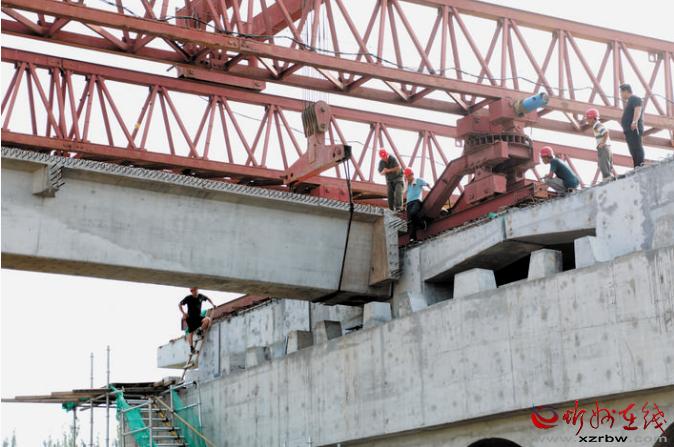 7月29日,原平市前進街東拓工程滹沱河大橋施工工地,大橋主跨預制混凝土橫梁從牽引車上徐徐吊起,穩穩地安放在主橋墩上。該預制混凝土橫梁長30米、高1.6米、寬2.4米,總重量93噸。這一突破性推進將大大加快工程進度。 褚 震 攝