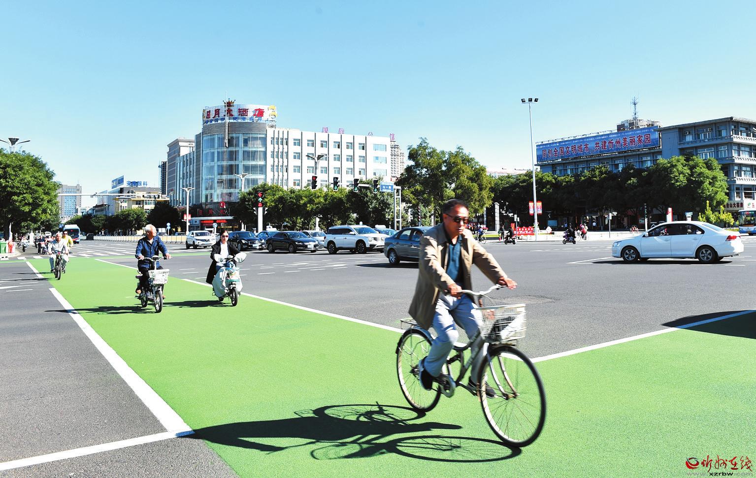9月3日,市民在忻州城區七一路與長征街交叉路口的自行車專用道上騎行。日前,忻州路面上出現人車分離“斑馬線”,行人走斑馬線、騎行則走專用自行車道,很好地實現了人和非機動車分流通過,為創建文明城市增色。 宮清華 攝