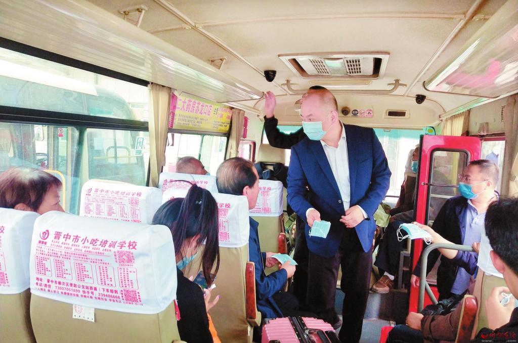 原平市交通運輸局加強對交通運輸企業、“兩客一危一貨”、旅游包車、網絡包車和重點路段的監督檢查,嚴厲打擊“三超一疲勞”、非法載客、超員超限、疲勞駕駛和違規冒險行車等違法違規行為。在抓安全的同時,將疫情防控常態化,強調汽車站工作人員必須做好登記工作,督促乘客佩戴口罩。圖為工作人員在客車上為旅客發放口罩。( 劉建春 攝)