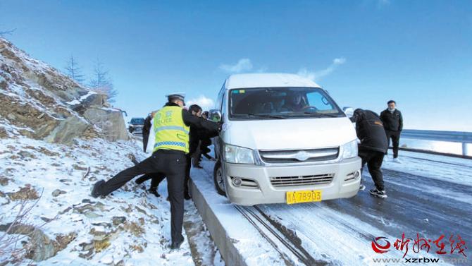 10月16日,五臺山景區境內出現雨夾雪天氣,伴隨著氣溫下降,部分路段出現積雪。當日7時許,五臺山公安分局接到游客報警稱,在景區北線鴻門巖路段,由于下雪后道路有大量積雪成冰,導致多輛大巴車和轎車受阻無法通行,請求援助。
