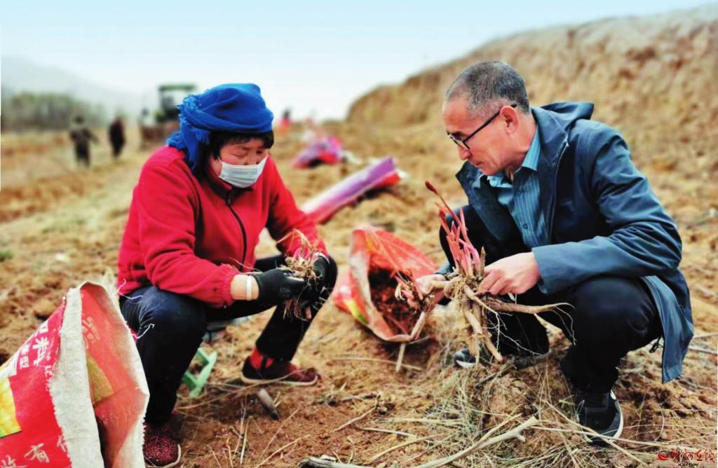 近日,五臺縣陽白鄉桑院村北部嶺坡地種植的大片芍藥進入收獲季。村黨支部書記、村委會主任李肖峰帶領村民忙著機械采挖、分級歸類、拾撿裝運、晾曬、銷售等,田間地頭一派忙碌景象。多年來,陽白鄉黨委政府不斷調整農業產業結構,通過鼓勵農民種植芍藥、黃芩、黃芪等中藥材,帶動當地群眾增收致富。上圖為機械采挖場景;下圖為李肖峰為村民講解藥材分級歸類注意事項。(王金龍攝)