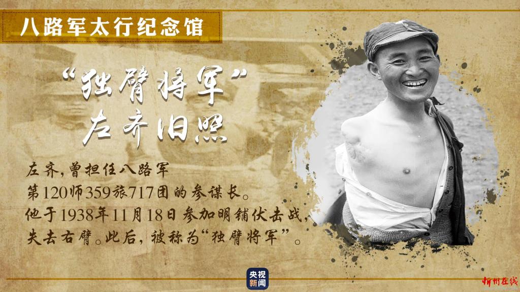 △“獨臂將軍”左齊舊照 一張獨臂將軍的舊照,展現出八路軍為爭取民族獨立,不怕犧牲、不畏艱險的革命英雄主義精神。 1938年11月18日明鋪伏擊戰中,左齊不幸右臂中彈。戰友們用褲腰帶纏緊他的右臂止血,走了三天三夜的山路,輾轉到了旅部所在地。 昏迷中的左齊不知道傷口竟有碗口那么大,他的整個右臂都已經發黑壞死。白求恩大夫連夜給他施行了右肩關節離斷術才保住了他的性命,但左齊卻永遠地失去了他的右臂。僅僅五個月后,左齊重返戰場。 習近平專程瞻仰了八路軍太行紀念館。在看望八路軍老戰士代表時,習近平飽含深情地說,革命前輩為奪取抗日戰爭的勝利和新中國的建立進行了不屈不撓的斗爭,作出了巨大的貢獻,黨和人民永遠不會忘記。 2014年12月13日,習近平參觀了侵華日軍南京大屠殺遇難同胞紀念館。