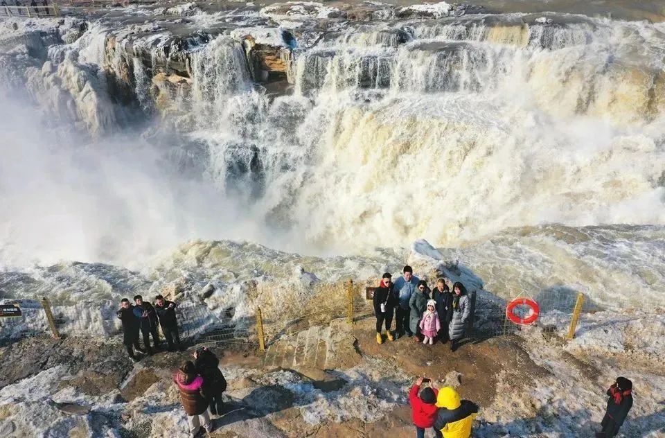 ▲2月9日,游客在吉縣黃河壺口瀑布游覽觀瀑。“立春”后,受氣溫回暖影響,吉縣黃河壺口瀑布冰消河開,再現(xiàn)奔騰咆哮的壯美景觀。呂桂明攝