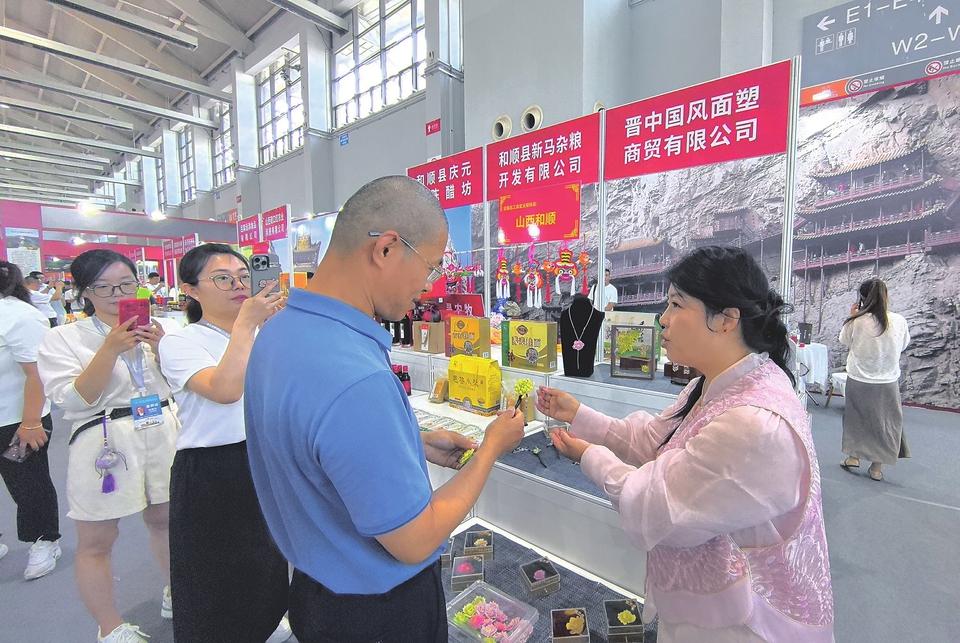 “中國雜糧之都”——忻州市組團參展,帶來15種雜糧產品,更別出心裁地將雜糧融入文創領域。偏關老牛灣旅游產業開發有限公司的展臺宛如一個調色盤,玉米粒、帶殼小米、紅豆等被巧妙擺成多巴胺色系的山西景點山水畫。一位參展商說:“雜糧做的藝術品,盡顯山西智慧,讓雜糧文化煥發新生。”