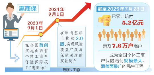 省市場監管局相關負責人表示,“惠商保”項目以“小保險”撬動“大民生”,通過“兜底+賦能”的雙重保障,將政策關懷轉化為個體工商戶可感知、可量化的獲得感。項目將持續迭代升級,在風險保障深度、服務賦能精度、生態共建廣度上發力,助力個體工商戶從“生存型”向“價值型”躍遷,為個體經濟高質量發展注入持久動能。截至2025年7月28日,“惠商保”已累計賠付5.2億元,惠及7.6萬戶商戶,成為全國個體工商戶保險賠付規模最大、覆蓋面最廣的民生工程。