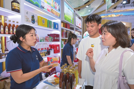 8月21日,忻州展區,市民正在品嘗神池月餅,了解胡麻油制作過程。本報記者申晉光攝