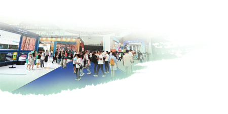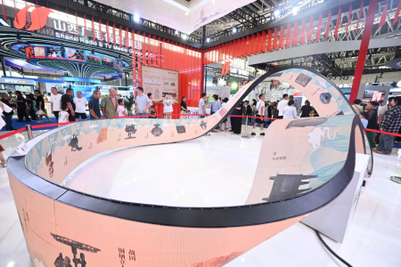 8月22日,山西文博集團展區,游客被莫比烏斯環柔性屏上展示的珍貴文物吸引。本報記者楊晨玉攝