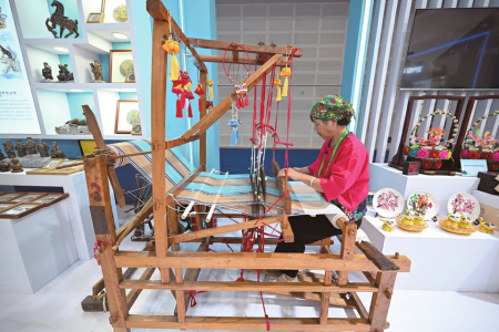 8月21日,運城展區,工作人員展示老粗布制作過程。本報記者阮洋攝