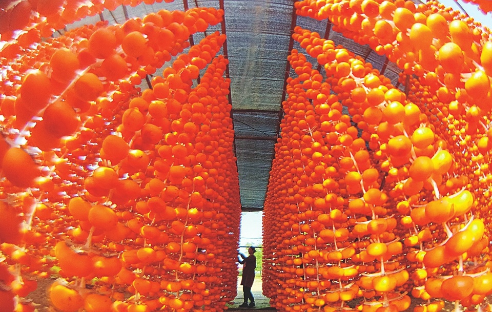 金秋時節,山西省運城市新絳縣陽王鎮禪曲村的柿子迎來豐收,連片金黃的果實掛滿枝頭。在該村種植加工大戶許永安的“家庭微工廠”,柿農們正忙著將柿子削皮加工、上架晾曬。