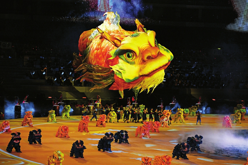 第十五屆全國運動會吉祥物“喜洋洋”和“樂融融”在開幕式現場表演。圖片均為開幕式表演現場。 本版圖片均來源新華社