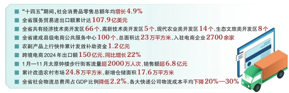 數字顯示,“十四五”期間,社會消費品零售總額年均增長4.9%,建成100個鄉村e鎮,打造了大同黃花等113個區域公用品牌。農產品上行快件補助帶動約33億元農產品銷售。實物商品網上零售額年均增長24.1%,高于全國17.1個百分點。