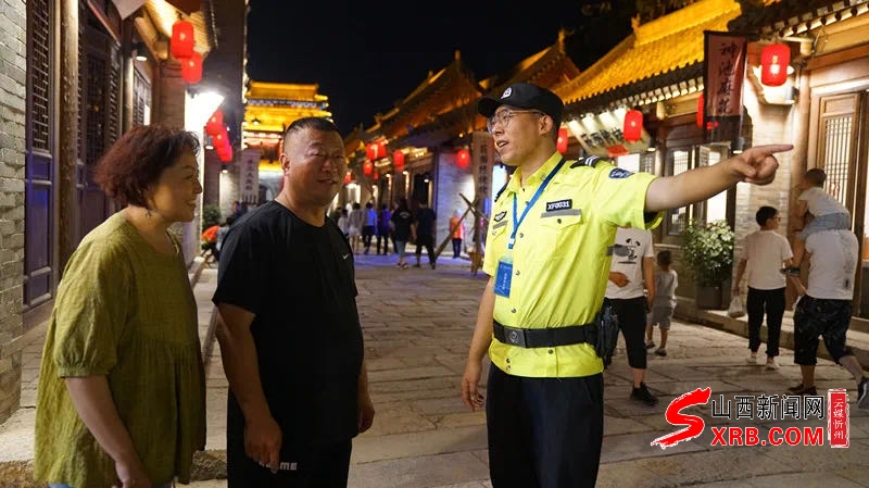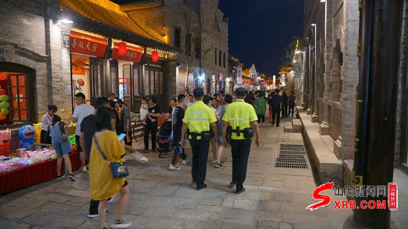 夜幕下的古城,華燈初上,忻府公安的警燈分外閃亮,巡邏民警穿梭在人群中,守護在群眾身邊,用最短時間、最快速度處理群眾緊急求助、處置各類突發警情,確保警力24小時不缺位,全力以赴守護景區和游客安全。(劉潔)