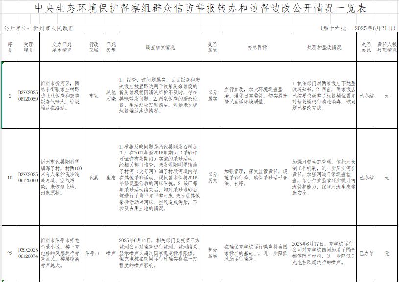 中央生態環境保護督察組群眾信訪舉報轉辦和邊督邊改公開情況一覽表(第十六批)