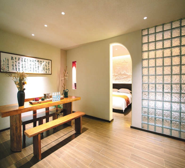 牧瑤溫泉民宿位于忻府區南關村。走進院內,大片玻璃窗通透明亮,門前蒼松與其他綠植讓人心曠神怡,潺潺流水和中式亭子的造景,增添了許多的靈動韻味。