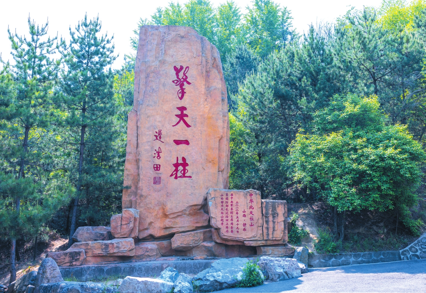 山路向南急轉后變得平坦舒緩起來,氣勢恢弘的建筑群呈現在眼前。右邊護坡上,是天柱山的“名人墻”,鑲嵌著靜樂九大名人的肖像,有功蓋千古的賢相,有戰功赫赫的名將,有學識淵博的鴻儒,有英勇無畏的革命者。不遠處,一塊赭色大石莊嚴矗立,上面是中央軍委原副主席遲浩田上將于2010年5月為天柱山的題詞:擎天一柱。將軍蒼勁有力的書法,與山之威武相得益彰。