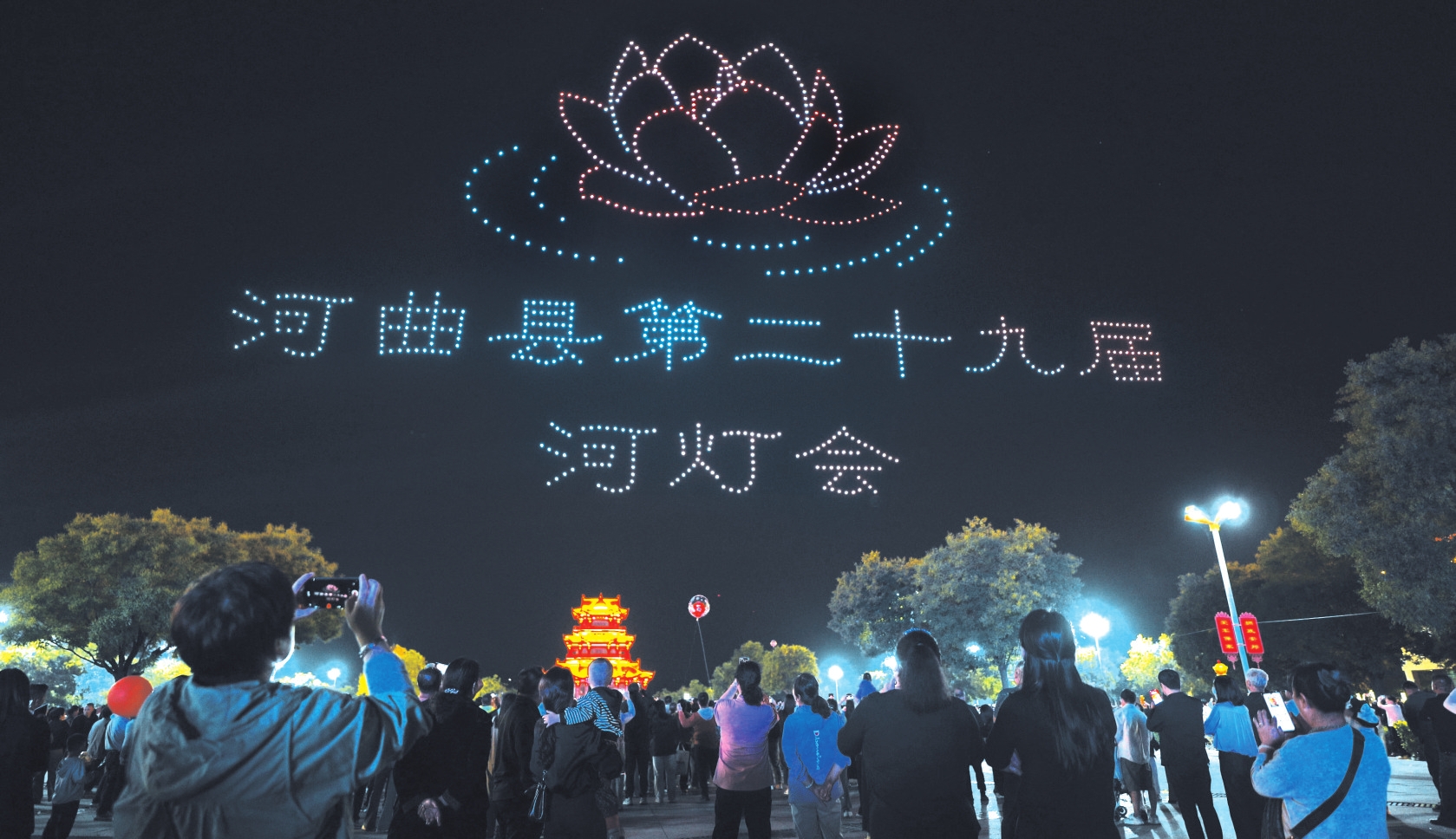 為期三天的無人機表演,創新采用3D動態編隊技術,通過40組高精度畫面切換,將河曲的地理標志、文化符號與時代精神深度融合,實現“一幕一主題、幀幀皆故事”的沉浸式體驗,以“科技+文旅”讓市民和游客領略大美河曲的獨特魅力。市民張一婷說:“能在家門口看到這么高水平的無人機表演,挺自豪的。這種創新的‘文化表達’方式將我們家鄉的故事用高科技手段‘寫’在了夜空這張畫卷上。這說明家鄉的發展不只在經濟方面,更是一種文化上的自信與創新。河燈與無人機燈光天地呼應,是傳統與現代的完美融合。”