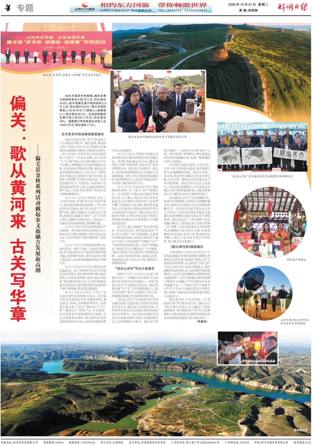 2025年國慶中秋“雙節”恰逢第八個中國農民豐收節,偏關縣委、縣政府為深入貫徹習近平總書記考察山西重要講話重要指示精神,全面落實省委十二屆十次全會、市委五屆九次全會和縣委十四屆十一次全會部署,學習運用“千萬工程”經驗,助力城鄉融合與鄉村產業振興,賦能偏關農文旅深度融合發展,促進金秋消費提質升級,激揚全縣奮發進取的創新合力,努力讓廣大群眾共享幸福生活,特組織開展“慶豐收·迎國慶·話團圓”系列農文旅活動。系列活動組織有力、氣勢恢宏、豐富多彩,在塑造偏關新形象、打造文旅新品牌的征程中邁出了堅實步伐,取得了良好社會反響和圓滿成功。
