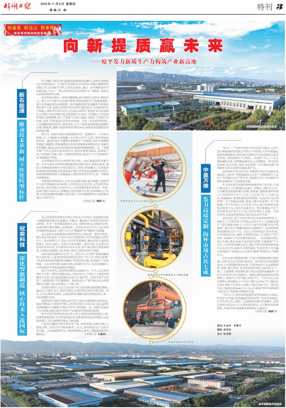 新石能源 推動技術革新樹立焦化轉型標桿 在“雙碳”目標引領與能源結構轉型的浪潮中,如何讓傳統焦化產業煥發新生?位于原平經濟技術開發區的山西新石能源科技有限公司,以創新為引擎,以綠色為底色,通過一系列硬核技改與創新實踐,開啟了一條從傳統焦化企業向現代化、智能化、清潔化企業蛻變的轉型之路。 面對環保治理這一轉型關鍵課題,新石能源主動攻堅、靶向發力。焦化生產過程中的無組織排放,特別是焦爐爐門的微量逸散,是行業普遍面臨的治理難題。新石能源將焦爐防逸散作為環保治理的重中之重,創新應用焦爐炭化室單孔調節技術,在傳統調節方式基礎上增加單孔炭化室壓力在線自動調節,使焦爐炭化室底部壓力在整個結焦周期內穩定維持微正壓狀態,不僅解決了傳統焦爐竄漏、冒煙難題,減少了荒煤氣與粉塵逸散,還提升了荒煤氣回收量,實現了環保效益與經濟效益雙贏。為進一步鞏固環保成果,公司前瞻性建設備用干熄焦系統,在主干熄焦裝置檢修或故障時實現無縫銜接,確保干熄焦率始終保持100%,徹底杜絕濕熄焦帶來的環境問題。 數字化、智能化是新石能源轉型的另一重要抓手。公司將大數據與人工智能技術深度融入生產核心環節,打造了焦爐智能加熱系統。通過在焦爐關鍵部位部署數百個傳感器,實時采集燃燒室溫度、煙道吸力等海量數據,再依托智能算法模型動態生成最優加熱策略,通過自動化執行機構實現毫秒級精準調控。這一“智慧大腦”不僅讓各炭化室受熱均勻、焦炭質量更加穩定,還降低了3%-5%的煤氣消耗,減少了氮氧化物排放,推動生產從“經驗驅動”向“數據驅動”轉型。 在資源循環利用與深度環保治理上,新石能源同樣步履不停。公司與高校合作研發脫硫廢液氧化轉化技術,將成分復雜、毒性大的脫硫廢液轉化為有價值的化工原料,徹底解決了高濃度有機廢液的處理難題;同時推進焦爐煙氣非甲烷總烴降解技術研發,在現有脫硫脫硝除塵設施基礎上增加深度凈化環節,進一步降低污染物排放。 憑借堅定的轉型決心與扎實的創新實踐,新石能源已連續多年入選中國能源企業500強、山西省綜合企業百強、山西省民營企業百強,獲評省級企業技術中心、山西省模范集體等榮譽。未來,這家扎根忻州的企業,將繼續以技術創新為引擎,延伸煤焦化產業鏈,在綠色低碳轉型道路上穩步前行,為區域能源革命與高質量發展注入更多活力。 (本報記者 魏鵬飛) 冠榮科技 深化智能制造核心技術入選國標 在山西冠榮科技股份有限公司的生產車間內,傳統煤機設備與智能控制系統正加速融合,勾勒出一幅傳統產業轉型升級的生動圖景。作為一家省級高新技術企業,冠榮科技正以創新為引擎,在高質量發展的道路上全速前進。自2016年創立至今,企業憑借對創新的執著追求,實現了從行業“跟跑者”到“領跑者”的跨越。 企業創始人楊淑榮是這場轉型的核心推動者。留學歸國后,她從基層崗位起步,于2016年創立冠榮科技,并率先組建企業技術中心。面對初期人才、資金、技術等多重挑戰,她親自深入高校招賢納才,逐步打造出一支高水平技術團隊。截至目前,企業累計申報發明專利5項、實用新型專利30余項,參與制定液壓類國家標準,并將每年銷售收入的7%投入研發,持續夯實技術根基。 創新成果迅速轉化為生產力。技術中心主導的“智能防輸送機失速系統”入選省級科技成果轉化項目;“礦山開采除塵裝置”“洗選系統智能雙側卸料運輸機”等項目的實施,顯著提升了設備效能。企業還率先推行ERP系統,推動數字化與工業化深度融合,在市場波動中構筑起獨特競爭壁壘。 面對市場變化,冠榮科技展現出戰略定力。今年,企業投資3500萬元的二期項目提前啟動,占地20余畝,計劃引入3套激光熔覆技術設備,重點推進智能化改造與產能擴張。該項目預計年底竣工,進度較原計劃大幅提前。楊淑榮坦言:“原平被認定為省級煤機專業鎮,為企業發展注入了強心劑。” 在轉型實踐中,企業主動為客戶的大型設備加裝智能化模塊,通過自主采購、設計、組裝與調試,實現傳統設備的功能升級。同時,公司正籌備電液控、永磁滾筒等關鍵設備的再制造項目,進一步拓展增長空間。 冠榮科技打造的“冠榮眾創空間”已成為區域創新生態的亮點。通過“零租金+天使投資”模式,該空間已吸引16家企業入駐,逐步形成智能煤機產業集群,實現技術共享、協同創新。這一舉措不僅盤活了企業資源,更成為原平開發區產業鏈協同發展的典型范例。 原平開發區管委會相關負責人表示,管委會將持續強化土地、政策等要素保障,優化營商環境,助力像冠榮科技這樣的鏈上企業輕裝前行,為區域轉型發展注入新動能。 從攻克關鍵技術到布局未來產能,冠榮科技以創新為楫,以智造為帆,正成為忻州推動新型工業化、培育新質生產力的中堅力量。正如楊淑榮所言:“唯有掌握核心技術,才能在風浪中行穩致遠。”(本報記者劉鑫林) 中盈萬維 發力高端定制海外市場占比七成 “哐當——”在原平經濟開發區東環大道旁,山西中盈萬維耐磨材料有限公司的生產車間里,行車吊著通紅的鋼坯緩緩移動,熱處理爐的轟鳴聲與冷卻塔的水流聲交織成一曲熱鬧的生產交響樂。在澆鑄工位上,工人正精準操控設備,將熔融的鋼水注入定制模具。原本冰冷的廢鋼,經過冶煉、澆鑄、熱處理等一系列精