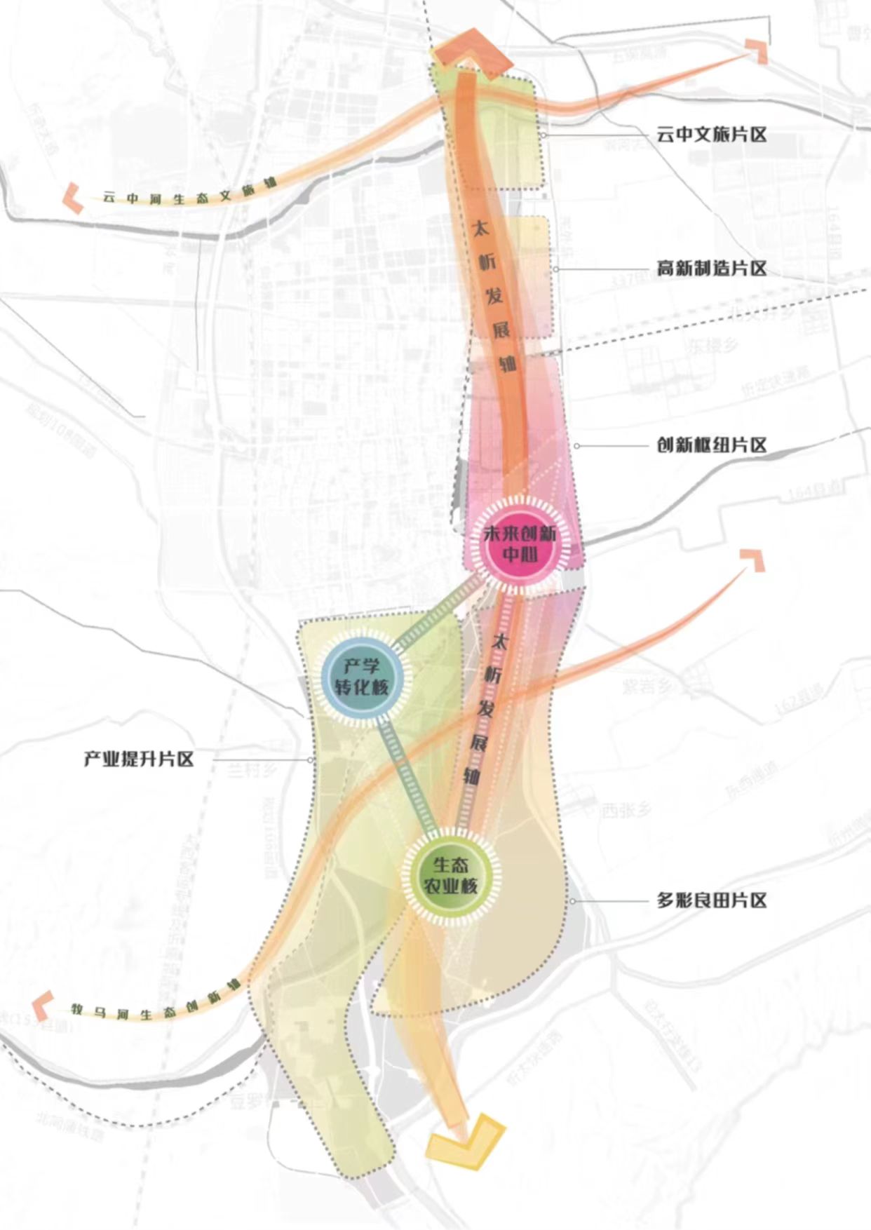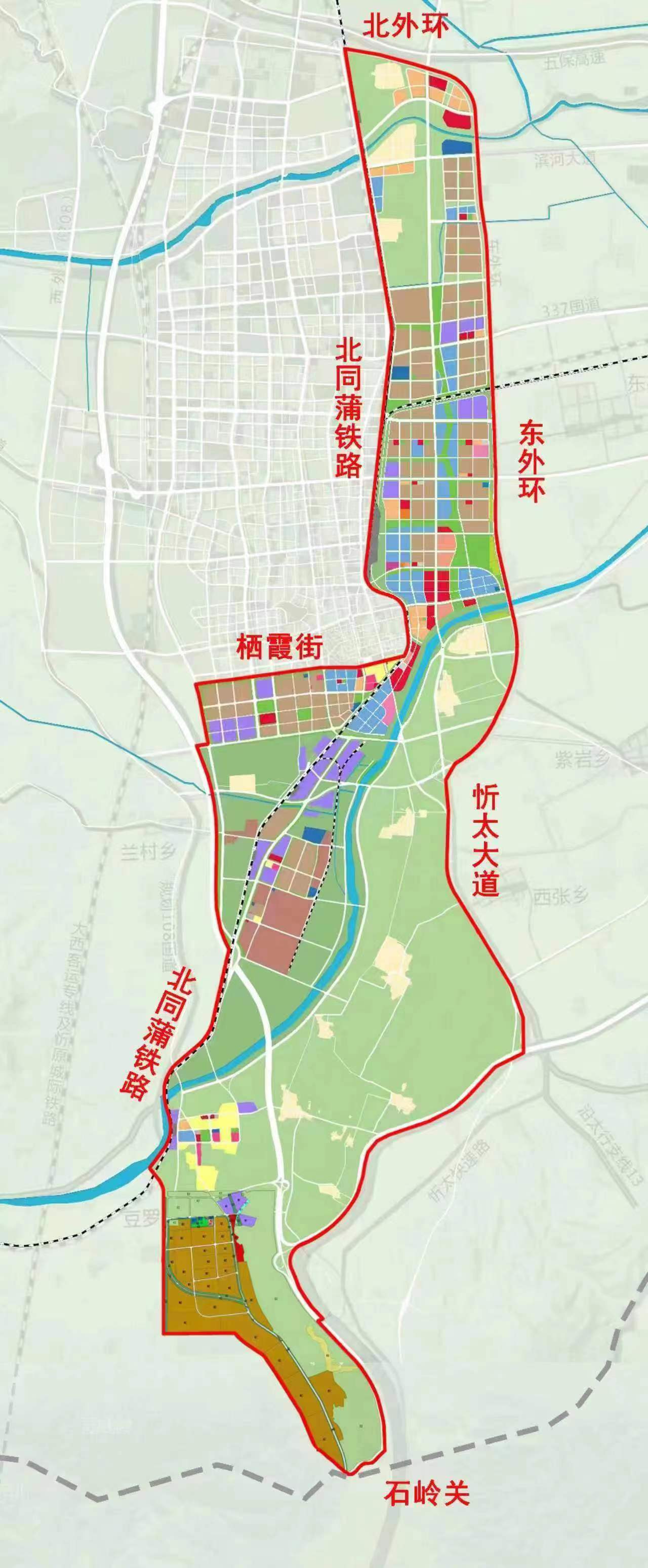 規劃面積約100平方公里,北至北外環,南至石嶺關(太原界),西至北同蒲鐵路,東至東外環。新區作為太忻一體化經濟區忻州片區的啟動區,堅持生態優先、綠色發展,統籌生活、生態、生產三大空間,以“一心雙核、三軸五片區”規劃布局,預留未來產業發展用地,重點發展雜糧產業、現代物流產業、新能源材料產業、文旅產業和科技創新智造產業,北部打造高新制造集合體、云中河東段打造休閑度假文旅區、中部打造創新樞紐核心區、西南部打造產業提升區、東南部打造多彩良田示范區,形成與大盂產業新城南北呼應之勢。
