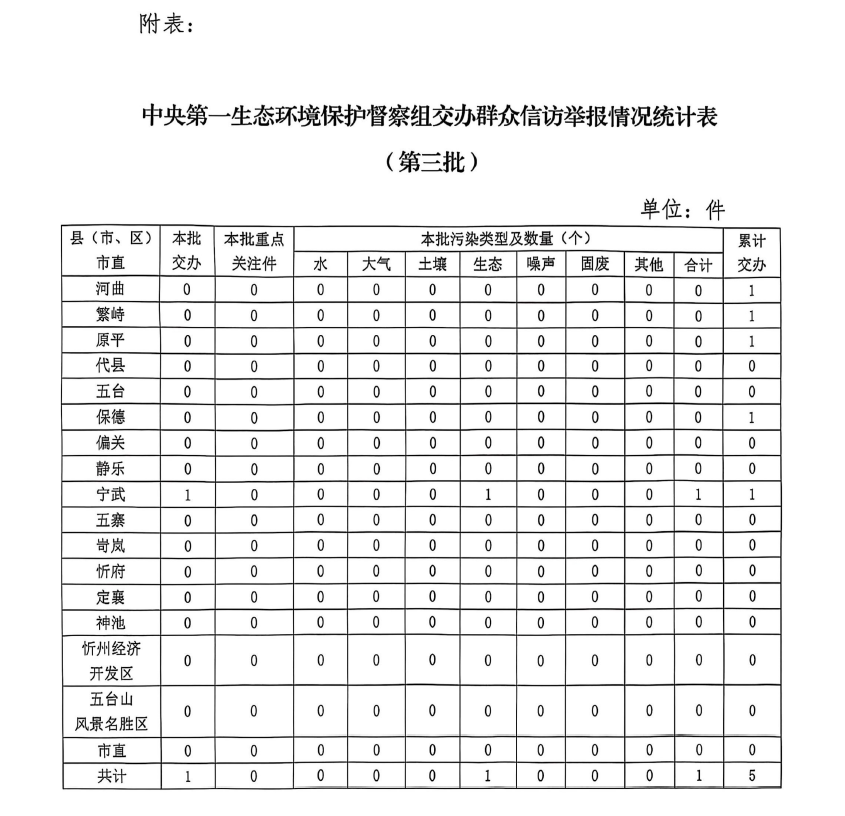 2025年5月31日,中央第一生態環境保護督察組向我市交辦的第三批信訪舉報件共1件,其中重點件0件。 按區域和部門劃分,寧武縣1件。本批轉辦的信訪件,涉及生態環境問題1個,其中,生態破壞問題1個。 當日,上述信訪舉報件均已轉交相關縣。 截止5月31日,中央第一生態環境保護督察組累計向我市交辦信訪件5件,其中重點關注件0件。交辦的信訪件中,涉及原平市1件、河曲縣1件、繁峙縣1件、保德縣1件、寧武縣1件;涉及生態環境問題5個,其中水污染問題1個、大氣污染問題1個、生態破壞問題2個、噪聲污染問題1個。 注:具體情況見附表